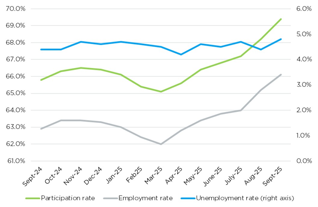 According to Statistics Canada’s Labour Force Survey (LFS), employment in the Québec City CMA recorded its sixth consecutive increase in September, reaching 499,600 jobs (+1.4%). Despite the ongoing uncertainty, this is a historic high. This evolution is supported in part by the growing labour force (+1.8%), which has now reached 524,700 people. Moreover, Québec City has maintained the lowest unemployment rate among the eight major Canadian CMAs (4.8%, +0.4 pp), placing it in second rank in the country, tied with Victoria. In this context, the employment rate has reached 66.1% (+0.9 pp).