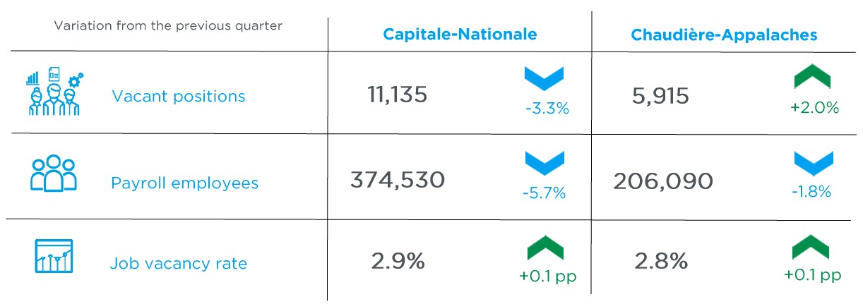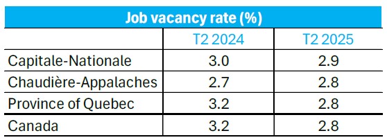 We should also note that, once again, this metric evolved differently in the two administrative regions, as the Capitale-Nationale registered a drop of 3.3% in vacant position this quarter, while the Chaudière-Appalaches region shows an increase of 2.0%. On an annual basis (Q2-2024 to Q2-2025), the number of vacant positions also fell in the Capitale-Nationale region, with a drop of 2.0%, while the number of vacant positions grew by 6.1% in Chaudière-Appalaches. Comparatively, this number dropped by 11.6% in the province of Quebec and by 12.6% in Canada over the same period.