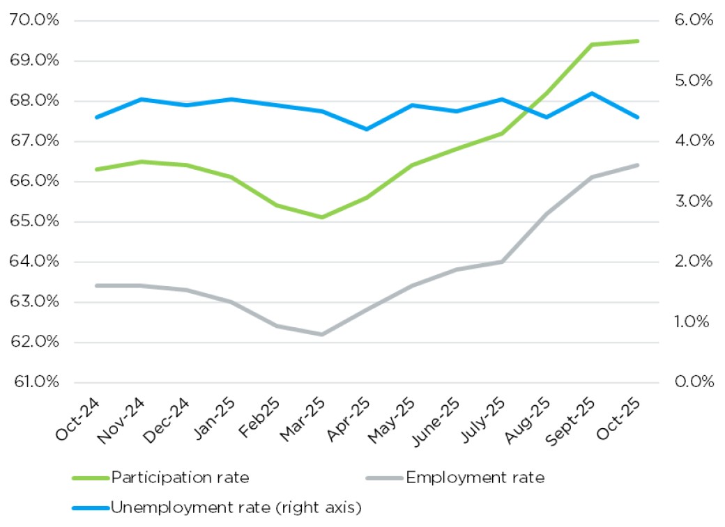 Other labour market indicators also reflect this relative resilience. Employment in the Québec City CMA grew by 0.3 pp, settling at 66.4%, while the labour force continued to grow, with a 0.2% increase, bringing the total to 525,700 individuals. These adjustments could reflect a moderate expansion of the region’s labour market in October, yet it is too soon to confirm whether this trend will continue, or if these are simply the result of seasonality and temporary sectoral rebalancing.