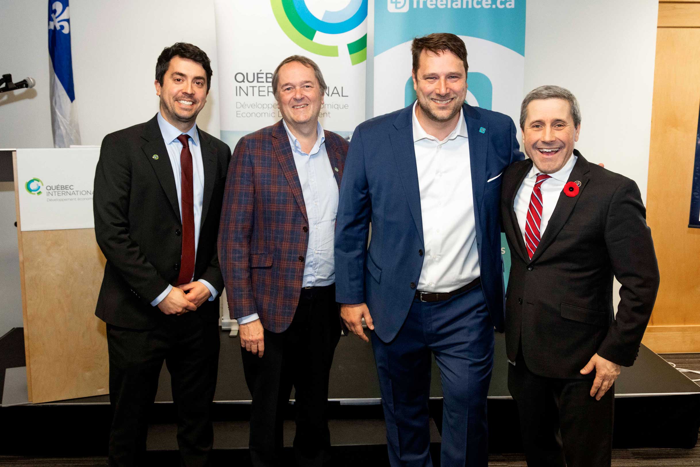 Sur la photo, de gauche à droite : François Robitaille, directeur principal –Investissements étrangers chez QI, Carl Viel, président-directeur général de QI, Simon Gravel, fondateur et président-directeur général de Freelance.ca, et Jean-François Simard, ministre des Ressources naturelles et des Forêts et ministre responsable de la région de la Capitale-Nationale.