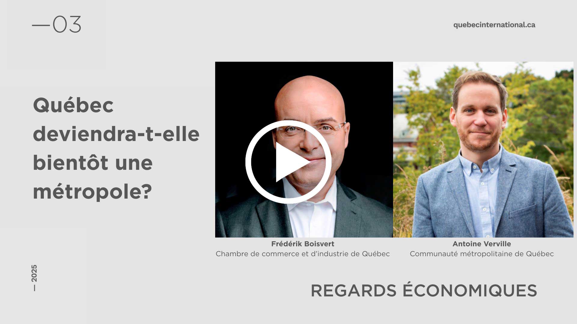 Dans le troisième épisode de la série de vidéos Regards économiques, notre économiste principal, Émile Émond, a discuté de croissance démographique avec M. Frédérik Boisvert, président et chef de la direction à la Chambre de commerce et d’industrie de Québec, et M. Antoine Verville, directeur de la planification territoriale, de la mobilité durable et du développement social et économique à la Communauté métropolitaine de Québec. Plongez dans cette réflexion et découvrez à quoi pourrait ressembler l’économie de la région dans les 20 prochaines années!