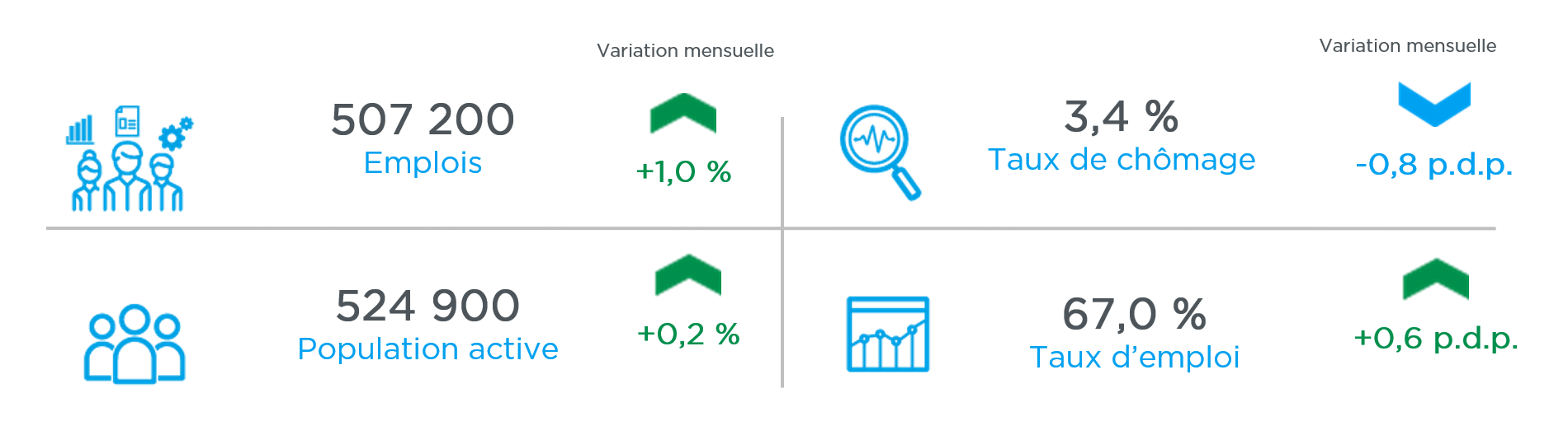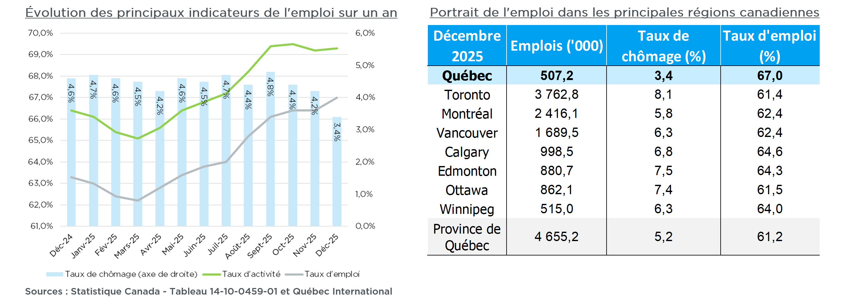 Selon l’Enquête sur la population active (EPA) publiée par Statistique Canada, le marché du travail a affiché une solide performance en décembre 2025, avec 507 200 emplois (+1,0 %) et une population active en hausse à 524 900 (+0,2 %). Le taux d’emploi a franchi le seuil de 67,0 % (+0,6 p.d.p.), une première en plus de deux ans, tandis que le taux de chômage s’est établi à 3,4 % (-0,8 p.d.p.), son plus bas niveau en 17 mois, plaçant la région au premier rang des RMR canadiennes pour cette dernière métrique.